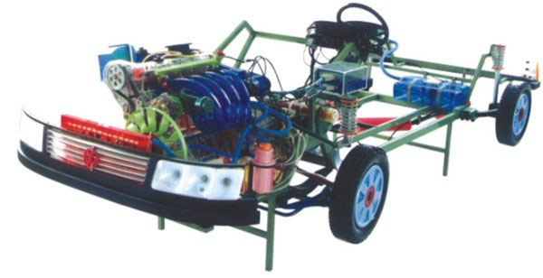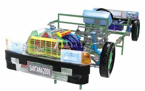 本品選用透明有機(jī)玻璃制作,內(nèi)中部件均以硬質(zhì)塑料料加工,用 螺絲固定在金屬高溫烘漆而成的車架上。各總成部分都以壓模成形加 工,代替過(guò)去膠粘合的方法,使產(chǎn)品在強(qiáng)度上有很大提高。發(fā)動(dòng)機(jī)總成用電機(jī)驅(qū)動(dòng),在油門(mén)處設(shè)有調(diào)速裝置,能演示發(fā)動(dòng)機(jī)轉(zhuǎn)速高低。離合器分離明顯,操縱靈活,離合器外殼整體壓模而成,變速箱和各檔齒輪用各種顏色表示,換檔靈活,手制動(dòng)美觀。后橋外形壓模而成,內(nèi)中主減速、差速轉(zhuǎn)動(dòng)自如,輪轂剎蹄壓模成型,剎蹄可調(diào)節(jié),前橋輪鼓可調(diào)整,轉(zhuǎn)向裝置以及電瓶、油箱、水箱,制動(dòng)管路分布清楚一目了然。電路采用對(duì)插件前后分布,燈架、風(fēng)窗、儀表板、后燈架用透明有機(jī)玻璃壓模成整體美觀逼真。