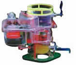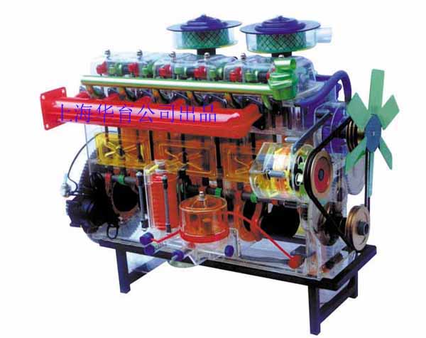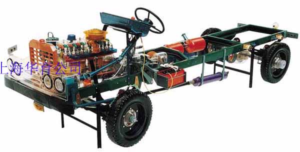 本品選用透明有機(jī)玻璃制作,內(nèi)中部件均以硬質(zhì)塑料料加工,用 螺絲固定在金屬高溫烘漆而成的車(chē)架上。各總成部分都以壓模成形加 工,代替過(guò)去膠粘合的方法,使產(chǎn)品在強(qiáng)度上有很大提高。發(fā)動(dòng)機(jī)總成用電機(jī)驅(qū)動(dòng),在油門(mén)處設(shè)有調(diào)速裝置,能演示發(fā)動(dòng)機(jī)轉(zhuǎn)速高低。離合器分離明顯,操縱靈活,離合器外殼整體壓模而成,變速箱和各檔齒輪用各種顏色表示,換檔靈活,手制動(dòng)美觀。后橋外形壓模而成,內(nèi)中主減速、差速轉(zhuǎn)動(dòng)自如,輪轂剎蹄壓模成型,剎蹄可調(diào)節(jié),前橋輪鼓可調(diào)整,轉(zhuǎn)向裝置以及電瓶、油箱、水箱,制動(dòng)管路分布清楚一目了然。電路采用對(duì)插件前后分布,燈架、風(fēng)窗、儀表板、后燈架用透明有機(jī)玻璃壓模成整體美觀逼真。